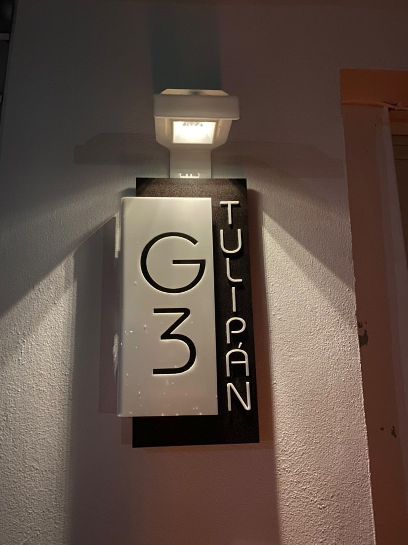 Opciones de lámpara solar y luz eléctrica. Escoge colores, la info que necesitas poner y estilo.